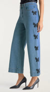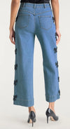 Elevate your look with the Rhinestone Bow Betsy Pant, featuring sparkling bow embellishments that add a touch of glamour to classic denim. Perfect for festive occasions, these jeans combine comfort with eye-catching style, making them a chic choice for your wardrobe.