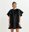 Cut from recycled polyester-blend jacquard with a tonal pattern, this A-line mini dress features soft flared sleeves and a gently gathered flounced hemline for subtle volume. A sculptural self-fabric flower brooch is positioned at the neckline as an embellishment. Designed with a hidden zip closure and side slit pockets for function. Fully lined for smooth wear.