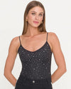 Sleek, simple, and sparkling, the Agnes Crystal Bodysuit is a night-out essential. Designed with delicate straps and a flattering scoop neckline, this fitted silhouette is finished with scattered crystal embellishments. Effortless to style, it’s the perfect base layer under blazers, paired with denim, or dressed up with leather for evening allure.
