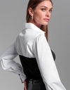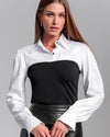 The Franny Poplin Combo Top redefines classic tailoring with a modern twist. A crisp white poplin shirt is seamlessly fused with a sleek black bodice, creating the illusion of effortless layering without the bulk. Sharp yet versatile, this high-contrast piece transitions seamlessly from office polish to evening chic—striking the perfect balance between sophistication and edge.