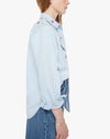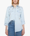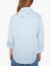 A Western-inspired denim button-up with front patch pockets and a curved hem. Made from 100% cotton, More Is More is a faded light blue with faux pearl snaps down the front and beaded details with rhinestones across the shoulders and chest.