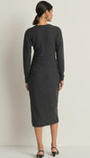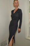 The Sandrine Midi Dress is chic and confident, with subtle stretch for all-day ease. Featuring a fitted silhouette, pleated waist, and a side slit, complemented by a V-neck and long sleeves. With this piece, simple feels special.