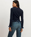 An everyday staple—with a flirty twist. Crafted from softly ribbed stretch cotton in navy, the Elianne long-sleeve T-shirt features a slim fit with lettuce-edge ruffles at the cuffs and hem. A clean crew neckline and contrasting light blue piping complete the look. Pair with your favorite VB denim and sneakers to elevate the everyday.