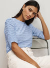 A feminine take on the classic crewneck tee. Made from 100% cotton for a soft, breathable feel, the Waldorf T-shirt is a true wardrobe essential. In striped sky blue, it’s elevated with our signature ruching along the elbow-length sleeves. Wear this casual-cool half-sleeve style with high-rise jeans for a chic everyday look.