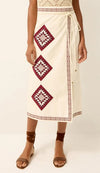 With its ivory-and-ruby palette and carefully placed geometric embroidery, Luca brings subtle artistry to the classic wrap skirt. Corded tie belts offer adjustability and ease, creating a flattering silhouette designed for warm-weather wear.