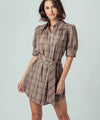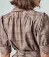 The Kambry dress is a standout style. Featuring warm fall tones with a subtle blue accent, this dress balances classic silhouettes with feminine detail. Designed with a button-up fit and slightly oversized collar, it’s finished with gentle gathering at the back yoke for a soft drape. The puff sleeves hit just above the elbow with subtle volume at the shoulders, while a self-tie belt offers versatile styling. Falling to fingertip length on most wearers, it’s an effortless piece to wear now and layer into fall.