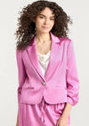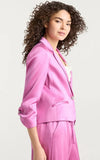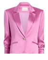Luminous and polished, this satin blazer is your versatile essential. The minimalist crystal embellished one-button front and cuff buttons exude elegance, while scrunched three-quarter sleeves add contemporary edge. In a vibrant, head-turning shade, it's perfect for professional settings, elevated events, and stylish daytime gatherings.