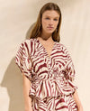 Full sleeves and a deep V-neck balance the Vesta top’s relaxed elegance, while a layered elastic waist creates a softly flounced peplum shape. The Lionfish stripe, with bold strokes of red and cream, brings graphic appeal to a set made for warm-weather escapes when worn with the matching Mirelle skirt.