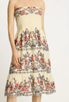 Adorned with the Zebra Leaf print—featuring coral red, blue, and purple florals with stylized leaves and zebra-striped accents—the piece showcases horizontal bands of intricate motifs for a rich, textural look. Finished with a soft flare at the hem for a romantic, cascading effect.