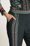 The Miller Pant in Twilight Bloom features a striking floral design that captures the quiet beauty of dusk. Layered over a deep, inky ground, the lush pattern showcases stylized blossoms and leafy motifs in soft coral, dusty teal, blush, and ivory—creating a romantic and artful contrast.