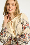 The Vickie Top in Zebra Leaf blends romantic charm with an effortless bohemian feel. Crafted from a soft lyocell-linen blend, it features a gathered neckline with a tie detail that creates a subtle keyhole opening.